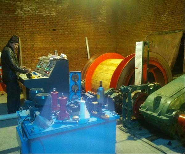 2、電機(jī)上下定子及轉(zhuǎn)子吊裝,用20T的吊車(chē)移到提升孔的位置;在吊裝到南門(mén)時(shí),在主井井塔的提升孔的位置,把起重機(jī)鉤頭和吊車(chē)同時(shí)掛上吊點(diǎn),一拉一松同步進(jìn)行,使其停放在提升孔的位置;然后用起重機(jī)起吊,注意繩頭和包裝箱接觸的地方要用木板墊好,防止受力時(shí)損壞包裝箱進(jìn)而損壞設(shè)備。JTPB-1.6×1.2防爆提升絞車(chē)導(dǎo)向輪的吊裝,等吊到第十三層時(shí)用5T千不拉配合起重機(jī)把導(dǎo)向輪牽引到六層井塔內(nèi),再用扒桿移動(dòng)到合適位置即可。